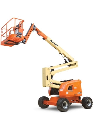 Diesel Articulated 45ft (13.72m) JLG Knuckle Boom Lift is 4WD, and suitable for outdoor and rough terrain use. This machine is designed to reach up ‘n’ over obstacles. Supplying safety at a working height of 15.72m with the capacity for teams of up to 2 people, this unit also has a horizontal platform outreach of 24ft (7.47m). 45ft Diesel Knuckle Boom Lifts are also available in a Genie model.