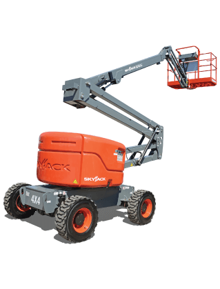 Diesel Articulated 46ft (14.10m) Skyjack Knuckle Boom Lift is 4WD, and suitable for outdoor and rough terrain use. This machine is designed to reach up ‘n’ over obstacles. Supplying safety at a working height of 16.10m with the capacity for teams of up to 2 people, this unit also has a horizontal platform outreach of 24ft (7.54m)